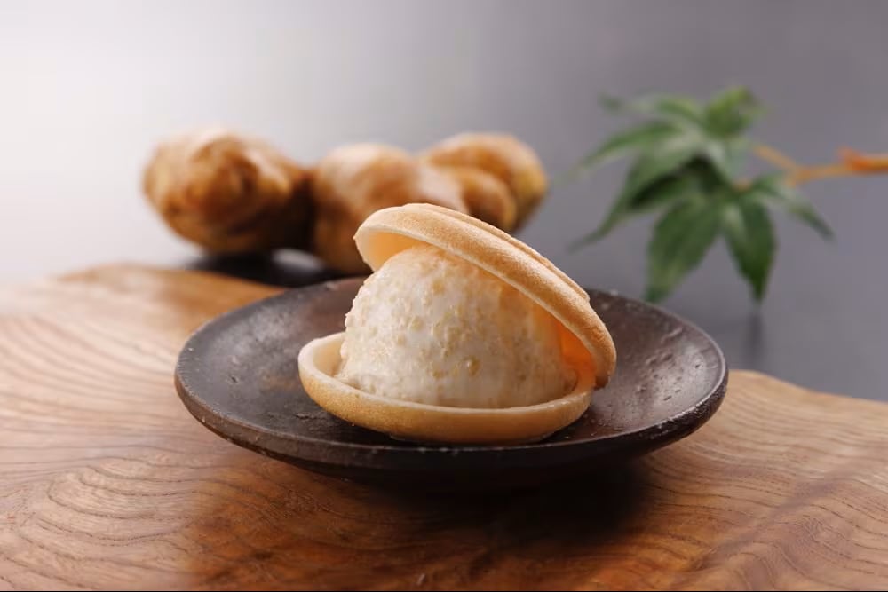 最中の皮は、パリっとふわっとした軽い食感。その中のアイスは、健康にも良い無添加の「新生姜」味で、相性は抜群。 ミルク味のあるアイスの中に、爽やかな新生姜味が口の中に広がる、どんなお食事の後にもぴったりのデザートです♪